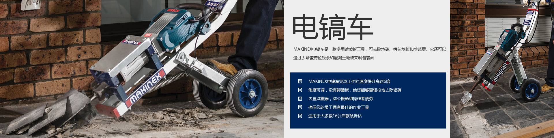 MAKINEX電鎬車(chē)是一款多用途破拆工具,可去除地磚、拼花地板和砂漿層。它還可以通過(guò)去除瓷磚位殘余和混凝土地板來(lái)制…